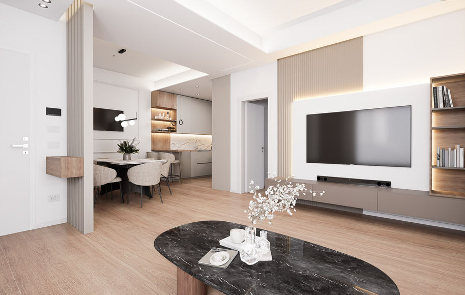 Il living open space accoglie una comoda zona giorno con angolo relax e una cucina a vista perfettamente integrata, pensata per la convivialità e la praticità quotidiana.